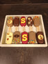 Huisgemaakte frisco's met vanille ijs en afgewerkt met fondant,melk en witte chocolade en chocolade decoraties.